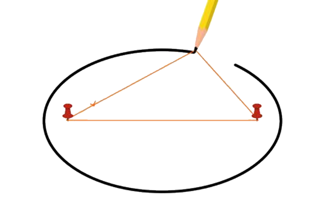To draw an ellipse, loop a piece of string around two drawing pins. Use a pencil to pull the string taut and, while keeping it taut, move the pencil around the two the pins.